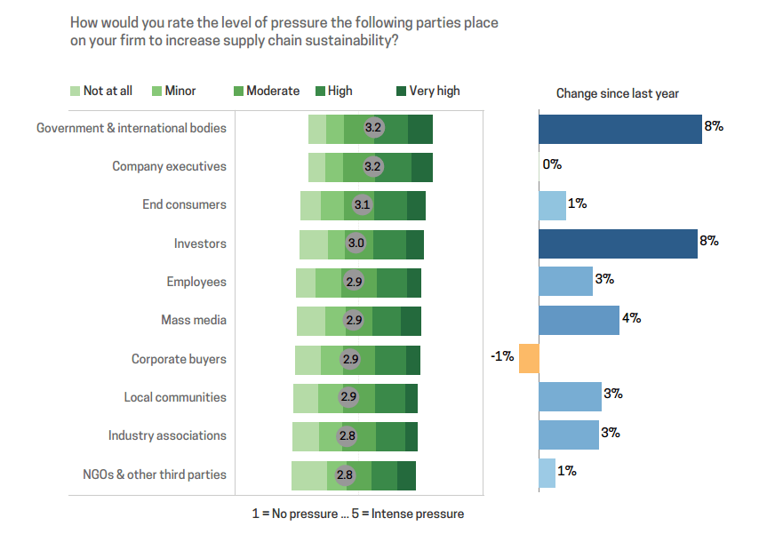 - the pressure to support sustainability in supply chains is coming from multiple sources, both internal and external. Pressure from investors, government and international bodies grew the most of all sources (see Figure).